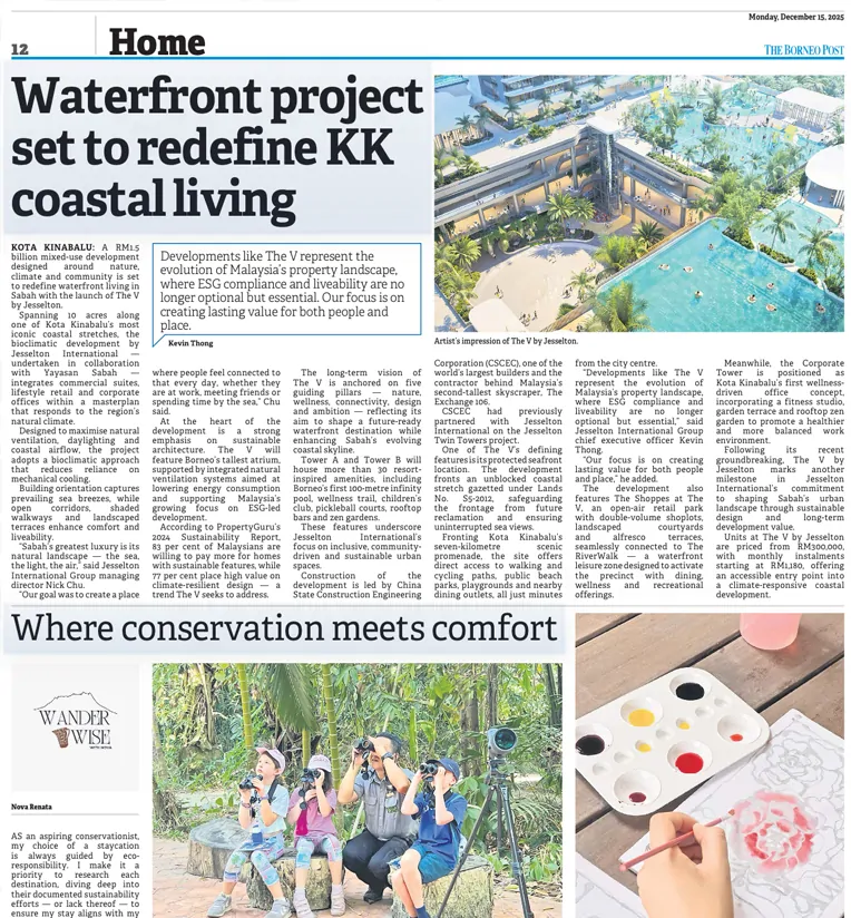 23 July 2025, Kota Kinabalu — Jesselton International officially unveiled The V by Jesselton, a RM1.4 billion integrated waterfront development at Likas Bay, developed in joint venture with Yayasan Sabah. Designed to redefine urban living in Sabah, the project blends premium serviced suites, curated retail spaces, and corporate offices into one vibrant ecosystem.